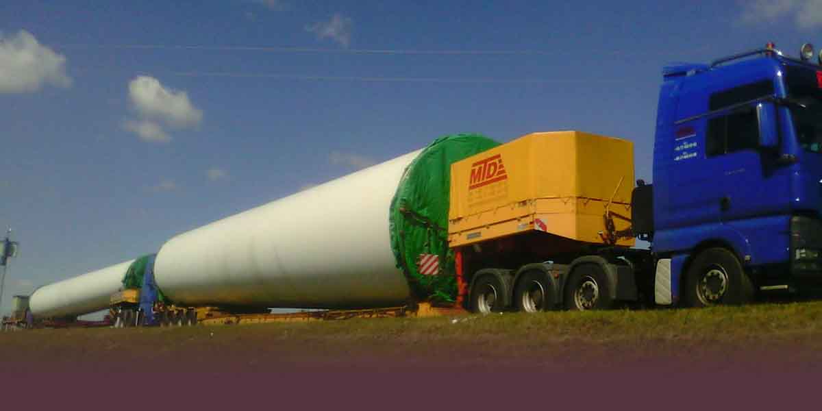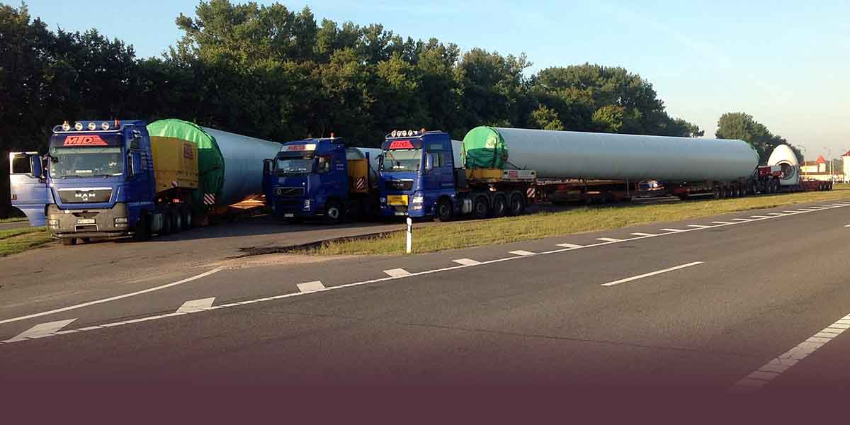 Transport wiatraku za pomocą siedmiu pojazdów.